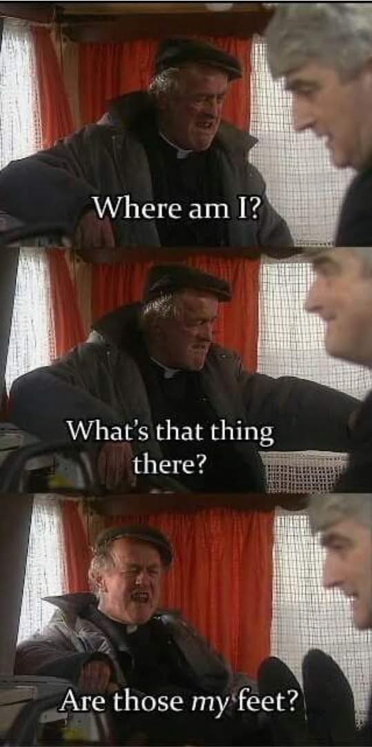 But for now I feel a bit like Father Jack. Where am I? What’s that thing over there? Are those my feet?