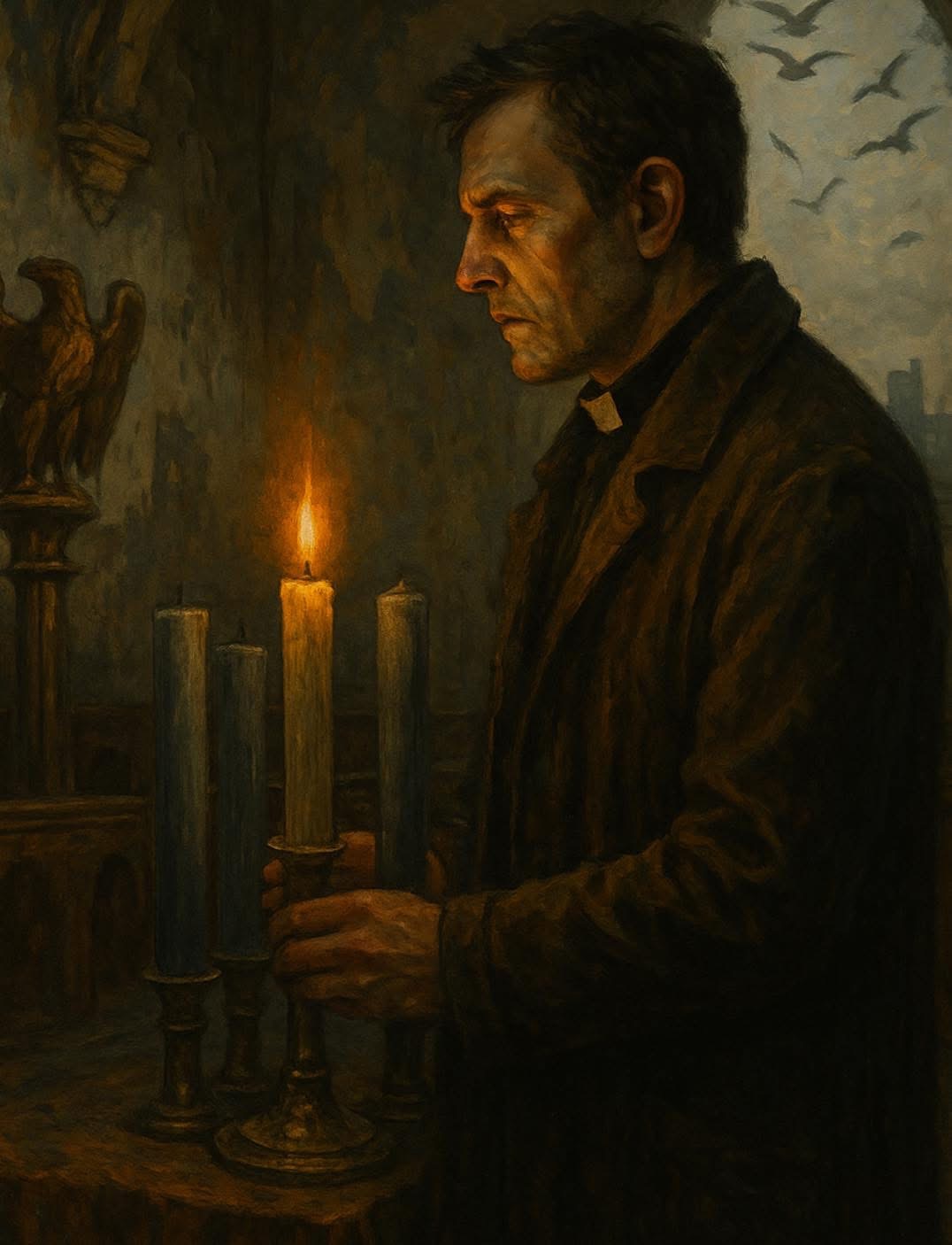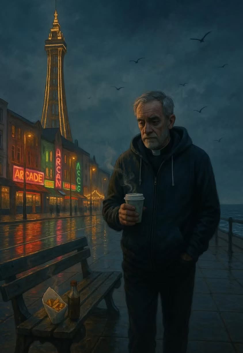 He has some powerful paintings of priests or vicars or ministers in different contexts. The image above reminds me of our call to hold the Christ light for people in the darkness every day. The image below is of a priest who sits on a bench on Blackpool prom and has lunch and waits for people to come to chat to.